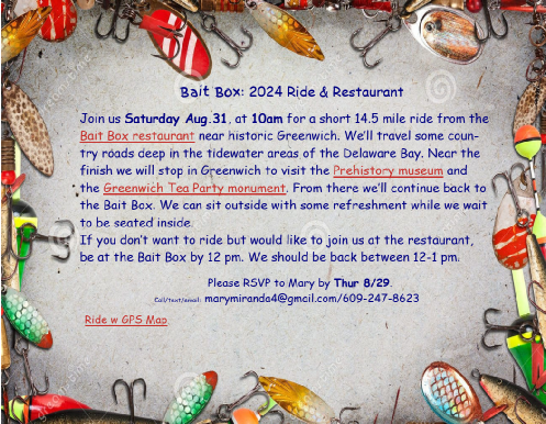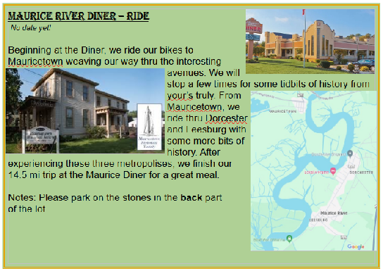 Of course both are “special”. Both also include a “ride” and a “meal”. The difference is who prepares the meal. At the speciality rides we go to a restaurant, ice cream parlor or some other commerical establishment. At the special events our own renown chef Mary Miranda prepares a fabulous picnic.