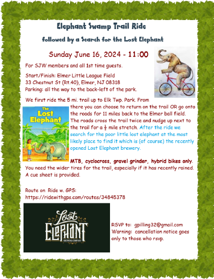 >E-Bike - Club Policy: Only class-1 pedal-assist electric bikes (e-bikes) shall be allowed at SJW rides and events. The motor must not exceed maximums of 750 watts power and 20 mph assist. E-bikes with a throttle assist option (class 2&3) are NOT allowed at any SJW ride or event.